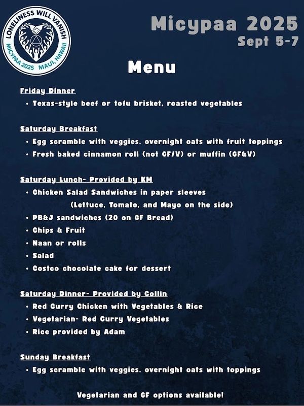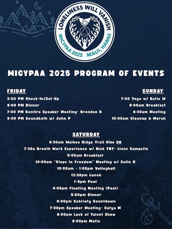 Come all weekend, just for a day, or just for an hour or two. Look at the schedule and see what suits you. We have food and friends, great speakers, and lots of other sober fun.